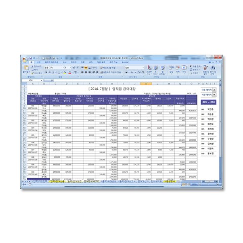 “급여 지급 명세서” 시트에서는 임직원 명을 펼침메뉴 버튼회전자 버튼을 이용해 편리하게 찾을 수 있습니다.